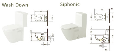 In wash down toilets, waste is simply “pushed” by free flowing water out of the trapway (usually 4” in diameter). The siphonic method on the other hand, employs a smaller outlet (usually 2” diameter) to slightly trap the flush water until it is filled enough for a siphonic action to pull the contents of the bowl out.