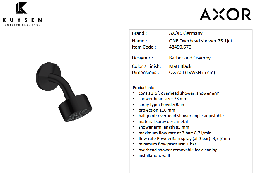 Axor One o/h shower 75 1jet ecosmart blk 48490.670