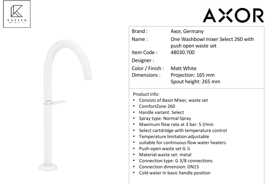 Axor One Select mixer 260 matt white 48030.700