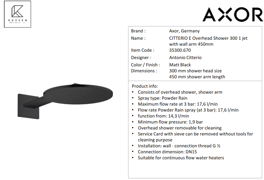 - DIMENSION: 300 mm shower head size, 450 mm shower arm length