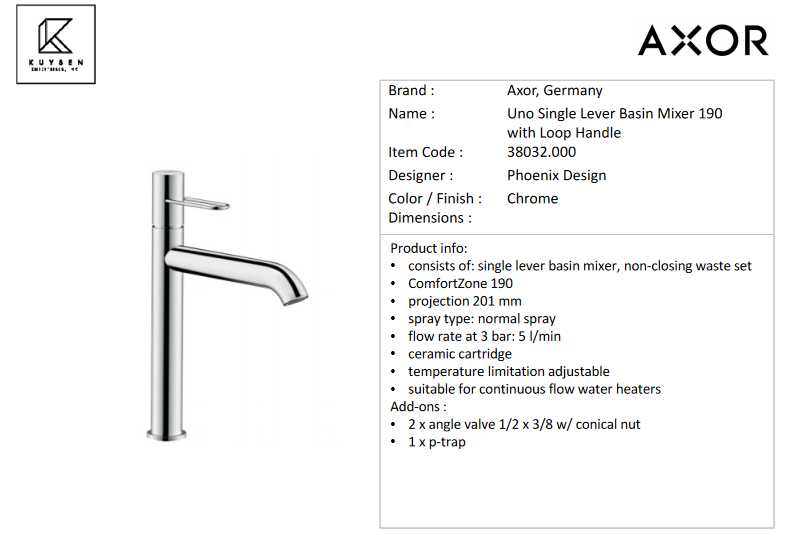 - Product Description: Uno Single Lever Basin Mixer 190 with Loop Handle