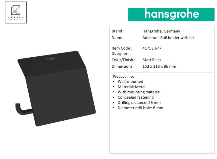 Hansgrohe AddStoris Roll holder with lid, Matt Black 41753.677