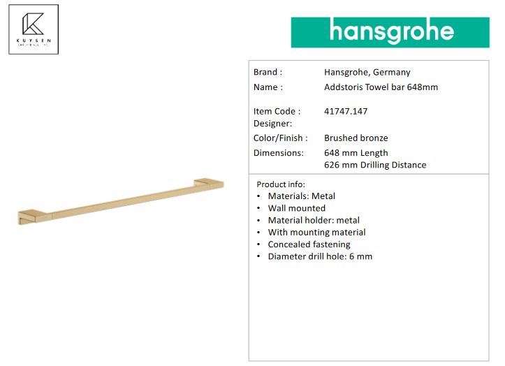 Hansgrohe AddStoris Towel bar 648mm, Brushed Bronze 41747.147
