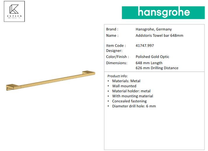 Hansgrohe AddStoris Towel bar 648mm, Polished Gold Optic 41747.997