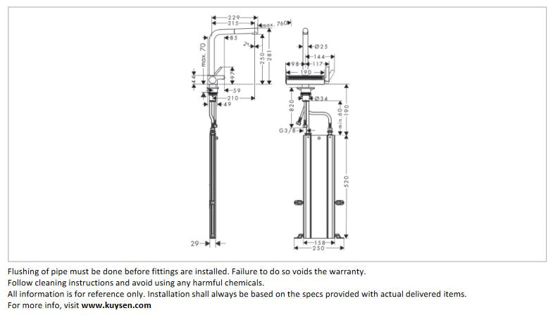 - PRODUCT DESCRIPTION: •consists of: single lever kitchen mixer, hose box, multifunctional strainer • ComfortZone 250 • l‐spout ∙ swivel range adjustable in 3 steps 60°, 110° or 150° • laminar spray, SatinFlow • change between SatinFlow and pull‐out spout at the touch of a button • MagFit magnetic shower support • maximum flow rate at 3 bar: 6 l/min • ceramic cartridge • connection type: G ⅜ connections • integrated non‐return valve • sBox for quiet, smooth and protected hose guidance in the cabinet, under the countertop • extension length up to 76 cm • tap hole with Ø 35 mm required, recommendation: the middle of tap hole drilling should be max. 45 mm from the back side of the bowl