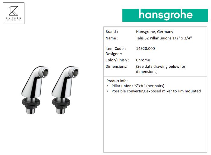 - PRODUCT DESCRIPTION: Talis S2 Pillar unions 1/2" x 3/4"