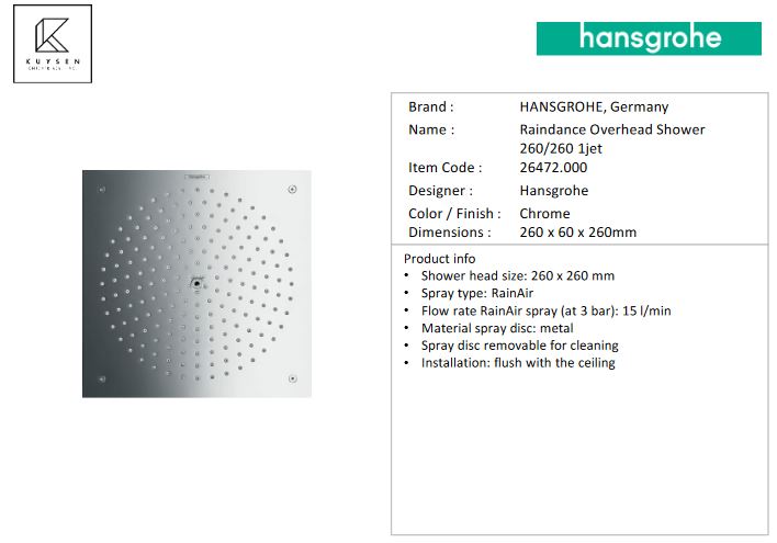 - PRODUCT DESCRIPTION: Raindance 260/260 1jet overhead shower - RainAir with 26471.180 basic set
