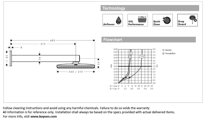 - DIMENSIONS: shower head size: 214 x 343 mm