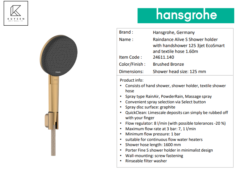 - PRODUCT DESCRIPTION: Raindance Alive S Shower holder with handshower 125 3jet EcoSmart and textile hose 1.60m