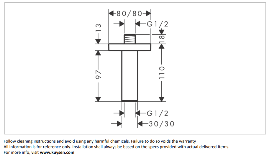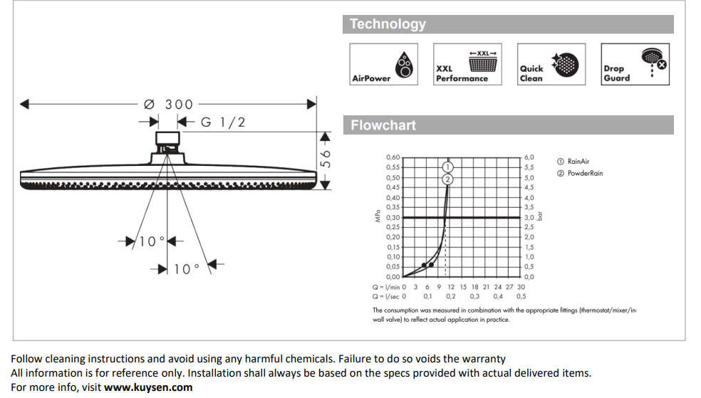 - DIMENSIONS: Shower head size: 300 mm, Ceiling connector 100 mm Length
