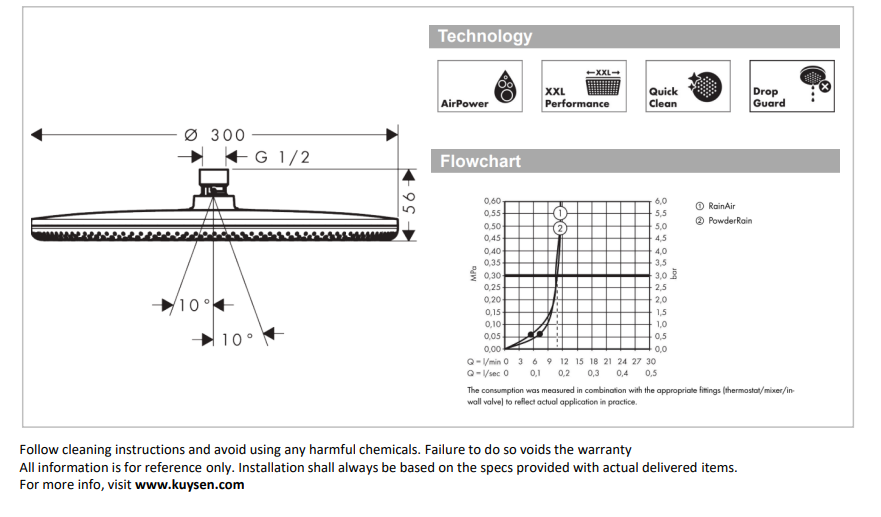 - DIMENSIONS: Shower head size overhead shower: 300 mm