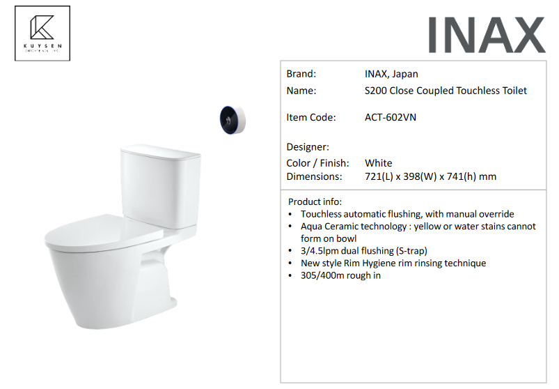 - PRODUCT DESCRIPTION: S200 close coupled touchless toilet