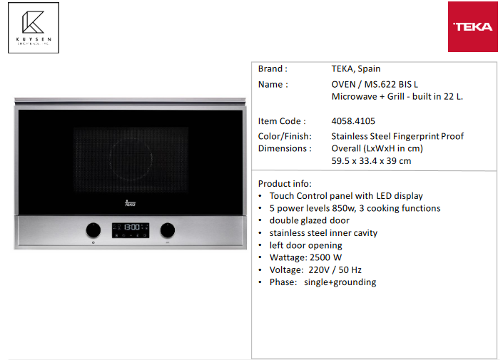 TEKA MS.622 BIS L Microwave + Grill - built in 22 L. 4058.4105